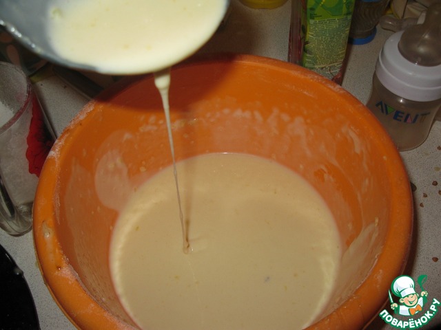 Растопить сливочное масло ( я это делаю в микроволновке), добавить все остальные ингредиенты. Муку я не всегда просеиваю, получается одинаково. Тщательно перемешать до состояния жидкой сметаны.