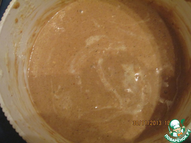 Дело в том, что происходит какая-то химическая реакция халвы с содой и тесто по истечении времени становится ярко изумрудным. Мы немного не дождались, и еще не весь торт стал ярко-зеленым. Если у вас хватит терпения, то вы увидите настоящее чудо.