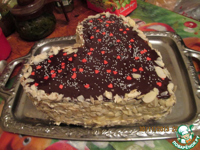 Собираем наш торт, украшаем по своему усмотрению. У меня - глазурь и миндальные хлопья, немного сахарных сердечек. И забываем про торт на сутки.