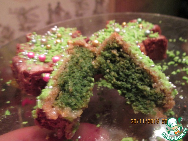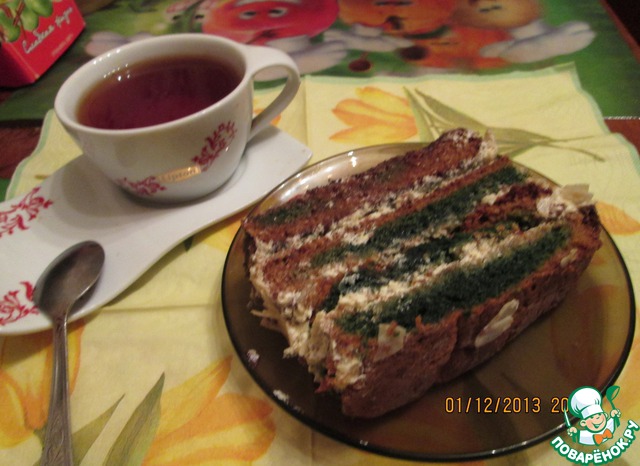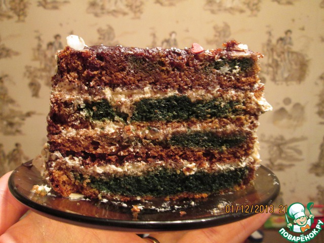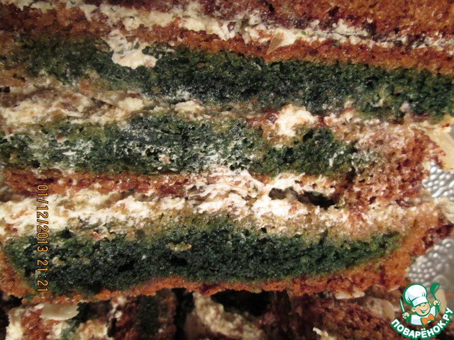 Мои дети не выдержали сутки и уже утром потребовали торт. Отрезаем, слышим изумленные вскрики и вопросы типа "Ты что, зеленку в тесто добавила?"