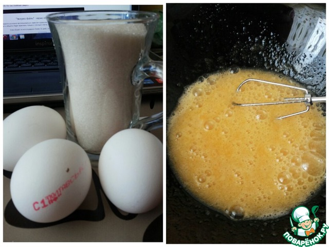 В миску вбиваем 3 яйца, добавляем 1 стакан сахара, растираем (взбиваем вручную). я взбивала венчиком от миксера, очень удобно