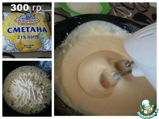 Добавляем 300 гр сметаны, продолжаем взбивать