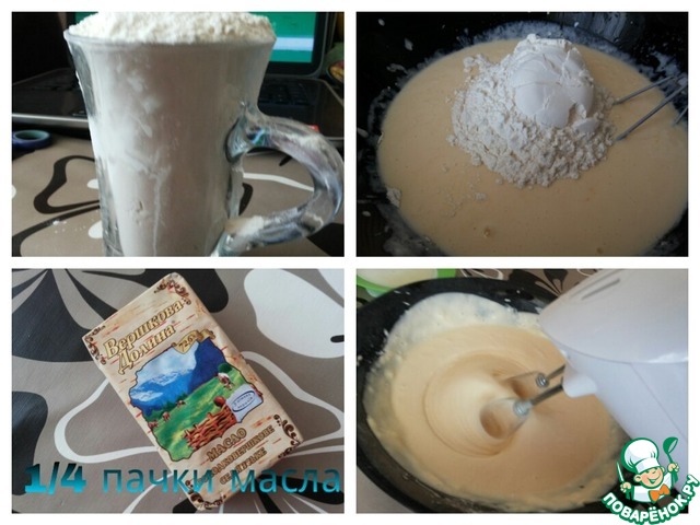 Добавляем 2 стакана муки и 50 гр масла, взбиваем. на этом этапе я уже подключила миксер