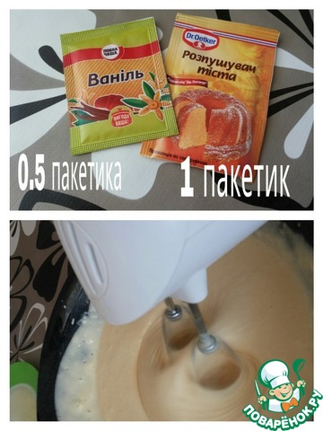 И добавляем ванильку и разрыхлитель. взбиваем еще пару минут на средней скорости, до исчезновения комочков от муки