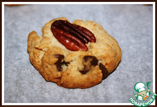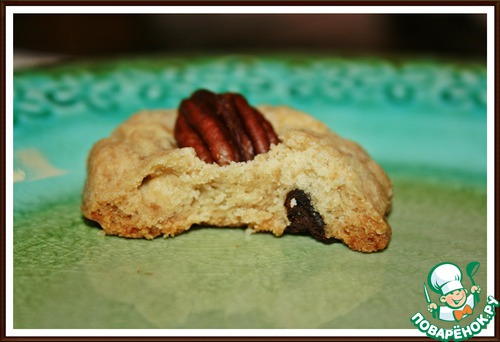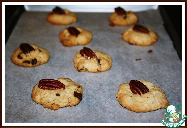 5. Противень выстелить бумагой. Из тесто сделать 24 шарика, чуток придавить и в серединку поставить орешек или шоколад другого цвета.
