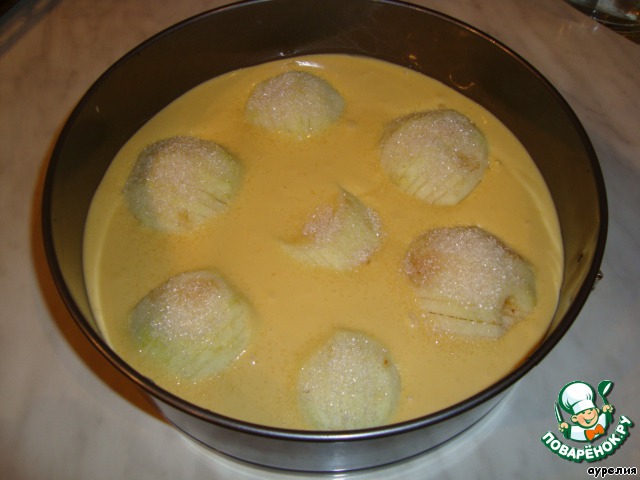 Форму для выпечки смазать маргарином или маслом,заполнить тестом,разравнять.Яблоки распределить на тесте выпуклой стороной вверх в виде цветка и посыпать сахором.