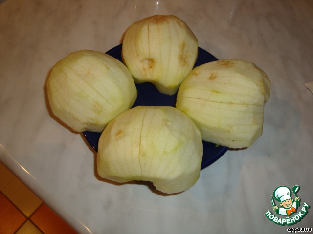 Яблоки очистить,разрезать попалам,удалить сердцевину и с выпуклой стороны надрезать вдоль острым ножом (до конца не прорезать) несколько раз с одинаковым интервалом.