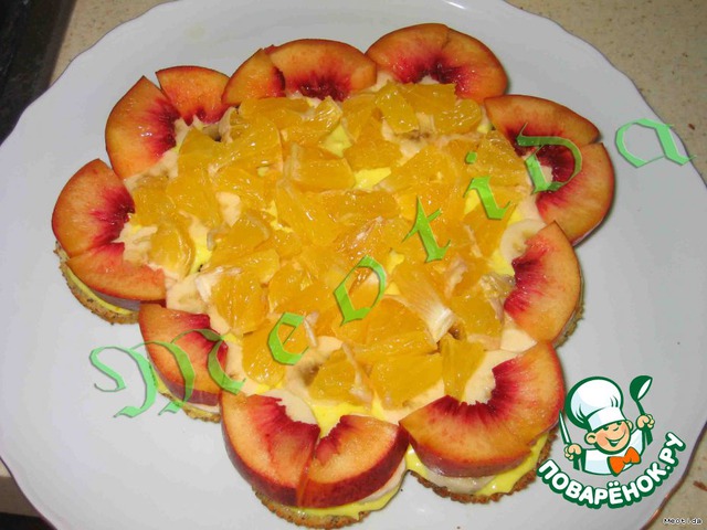 Апельсин очистить от кожуры, нарезать мелко и выложить (ВМЕСТЕ С СОКОМ, ОБРАЗОВАВШИМСЯ В ПРОЦЕССЕ РЕЗКИ!) в центральную часть тортика.