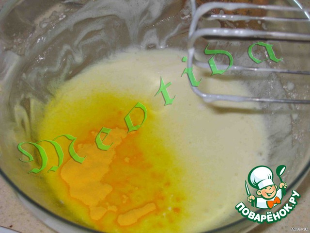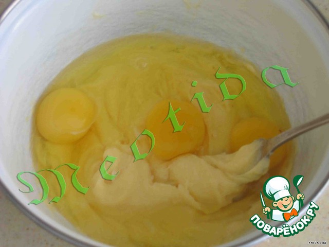 Мед смешать с маргарином (комнатной температуры), добавить яйца.