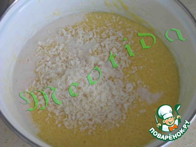Взбить в однородную массу сметану, сахарную пудру, лимонный сок, тертую цедру, коньяк и кокосовую стружку.