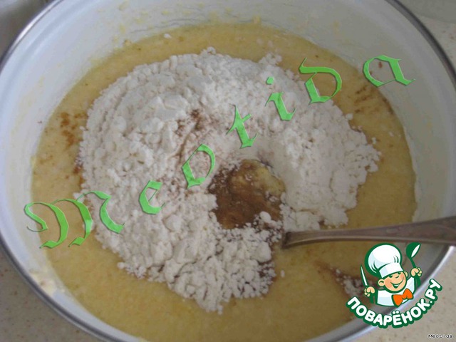 Добавить муку, корицу, мускатный орех и лимонный сок, миксером взбить все до однородности.