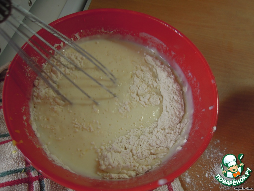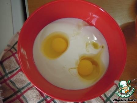 Влить кефир (у меня достаточно густой, если у вас более жидкий, возможно, понадобится больше муки), добавить 2 яйца, перемешать до однородности, нет необходимости взбивать;
