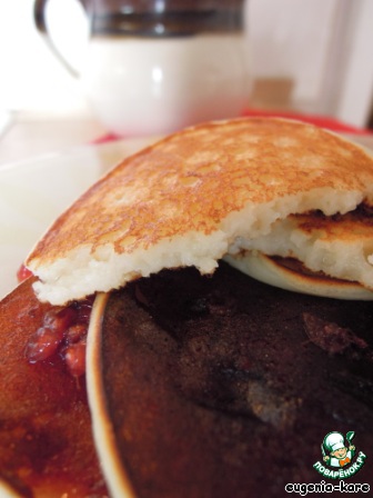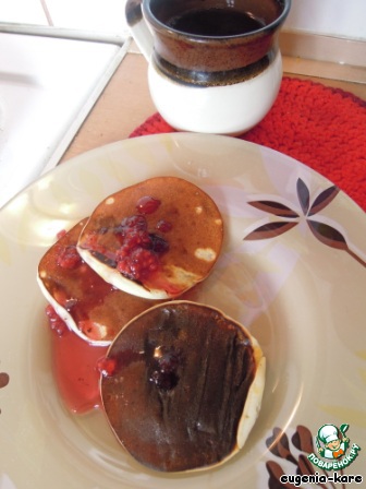 И вот моя первая порция, политая малиновым вареньем - что может быть лучше таких оладушек с легкой кислинкой и со сладким вареньем и горячим чаем?!