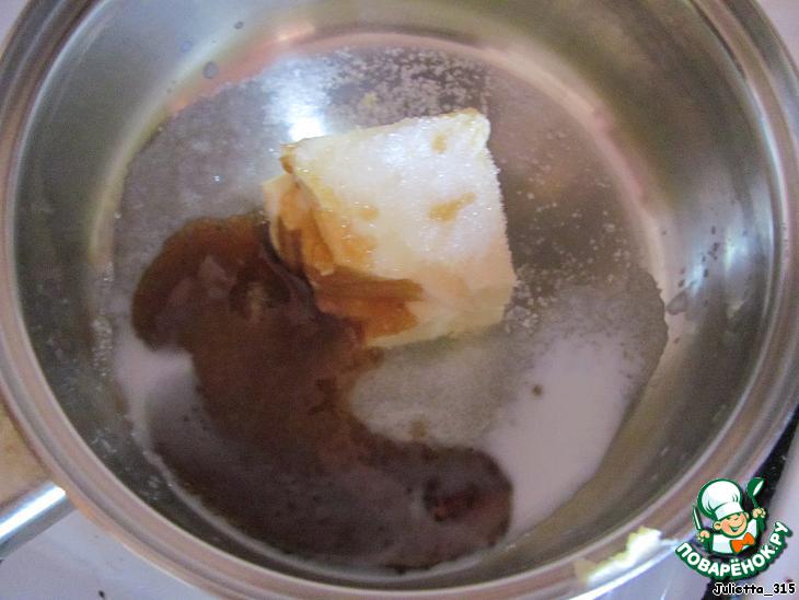 В кастрюле на медленном огне разогреть масло, мёд, сахар, молоко.