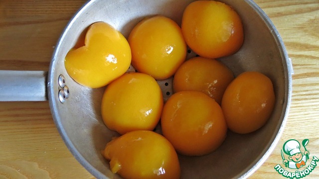 Тем временем, подготовим начинку для блинчиков. Персики достаем из сиропа и кладем на дуршлаг, чтобы ушла лишняя влага.