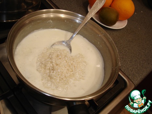 В горячее молоко кладете рис и сахар, варите на медленном огне в течение 25 минут до готовности. Оставьте под крышкой рис до полного охлаждения.
