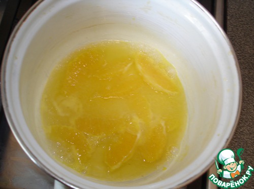 Очистите апельсин, филеруйте его над емкостью, чтобы собрать сок. Отожмите остатки сока из апельсина. Добавьте к соку нарезанную мякоть апельсина, сахар и проварите в течение 3 минут.