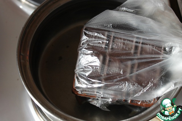 Шоколад необходимо растопить. Я это делаю так: складываю шоколад в полиэтиленовый мешочек, мешочек опускаю в горячую воду и жду пока растопится. Потом просто проделываю дырочку в мешочке и выдавливаю мягкий шоколад в тесто. Никакой водяной бани, никакой грязной посуды