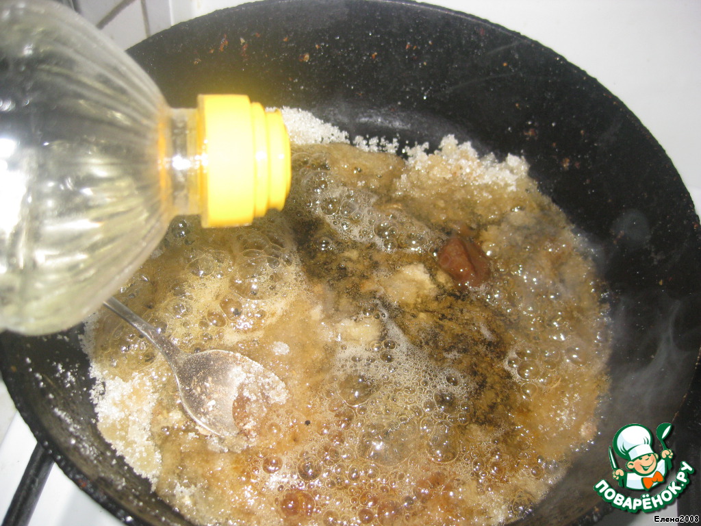 5. Как только сахар на первой сковороде начинает плавится можно влить сироп варенья, затем масло и воду(лимонный сок). (Если сироп не добавляете - влейте на 2 ст. л воды или лимонного сока больше).