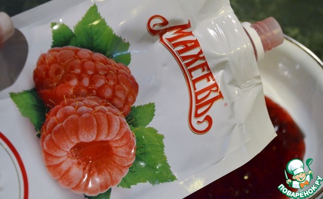 Прогреть малиновый джем ТМ Махеевъ в сотейнике, добавить столько сиропа, чтобы получился густой соус.