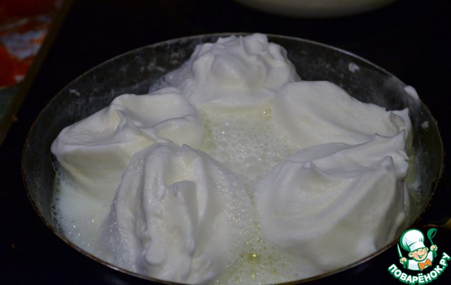 Вскипятить молоко с 500 мл. воды в глубокой сковороде. Двумя ложками сформировать "островки" из взбитых белков и осторожно положить в сковороду. Варить порциями 8-10 минут, один раз перевернув.