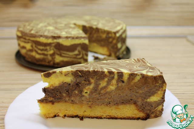 На корж выкладываем по очереди, по 3 ст ложки, апельсиновую и шоколадную массу - получается полосатая поверхность и зубочисткой круговыми движениями делаем рисунок.