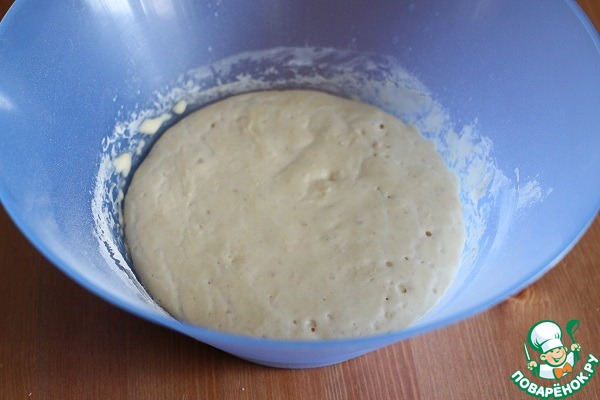 2. Добавить половину муки, замесить и поставить тесто подходить на 40-50 минут.