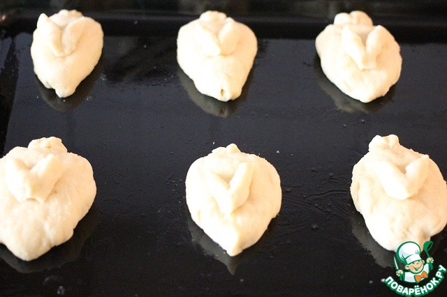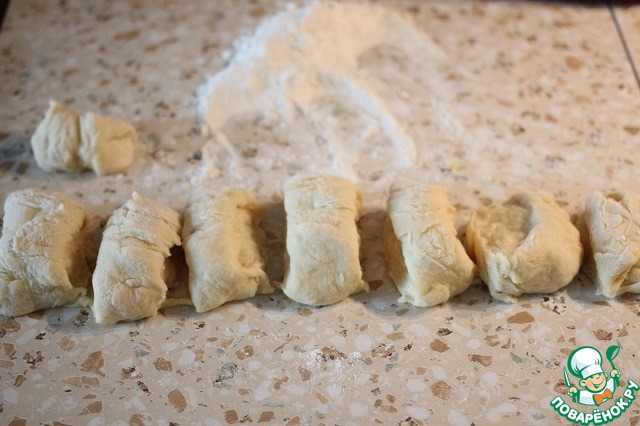 Тесто обмять, раскатать, разделить на небольшие кусочки.