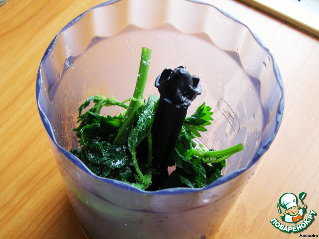 Зелень положить в блендер, добавить немного соли (по желанию) и перемолоть.