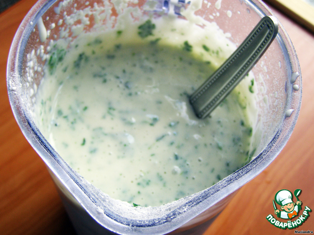 Все ингредиенты для оладьев смешиваем блендером, к получившейся однородной массе добавляем измельченную зелень крапивы и одуванчика.