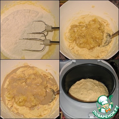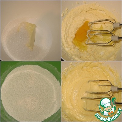 Добавить муку к яично-масляной смеси, размешать. Получиться очень густое тесто. Мешать его тяжело, да и не нужно стараться вымесить до гладкости.