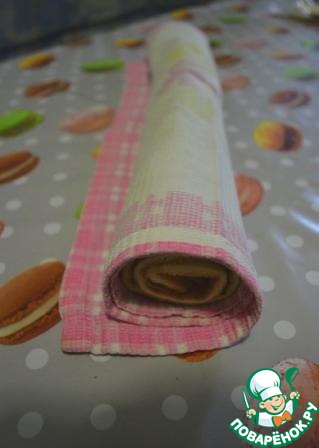 Накрыть сверху полотенцем и свернуть рулетом, оставить остывать.