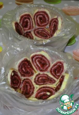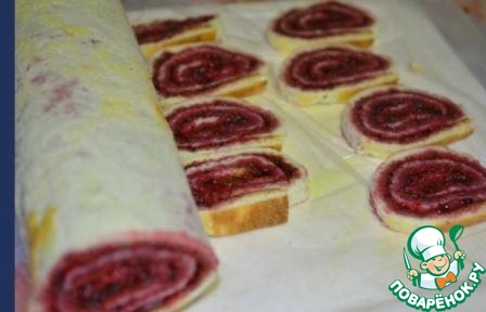 Готовый остывший бисквит раскрутить, промазать брусничным соусом.