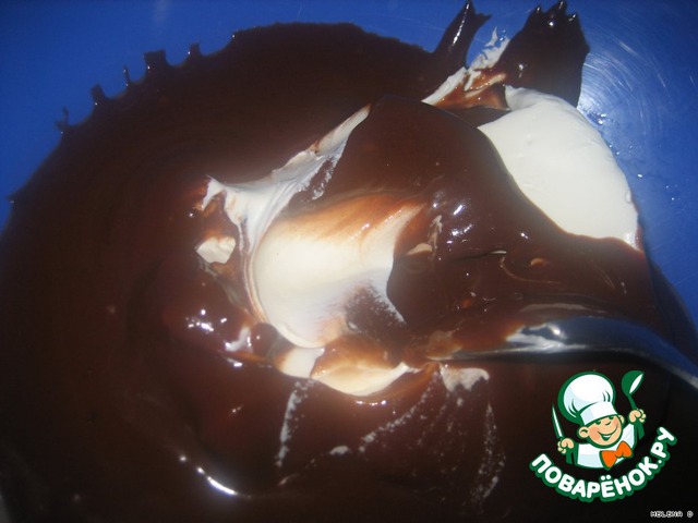 А пока остывает пирог, готовим крем: соединяем (охлаждённую) шоколадную пасту: http://www.povarenok .ru/recipes/show/183 82/ и сыр маскарпоне..