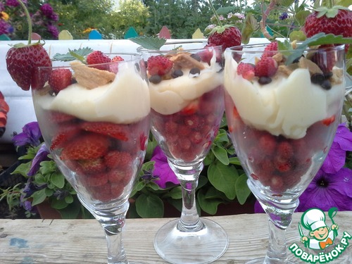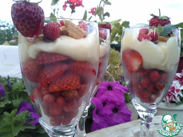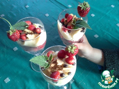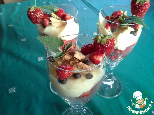 Подбираем подходящую посуду (у меня бокалы) и собираем наш десертик: на дно сыпем землянику, затем клубнику, разрезанную на половинки, крем. Украшаем раскрошенным печеньем, шоколадной крошкой и листочками мелиссы или мяты. Десерт готов!