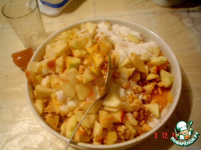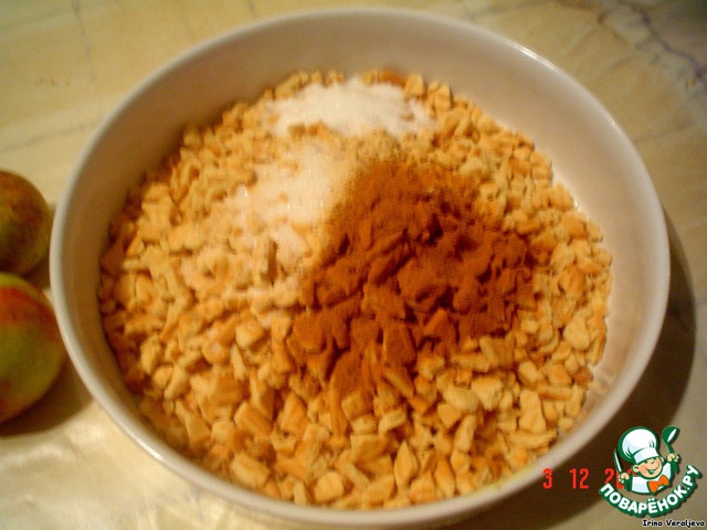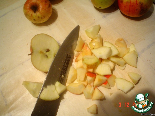 Добавила порезанные и очищенные яблоки. Размер и форма - как нравится, я порезала примерно 1 х 1 см.