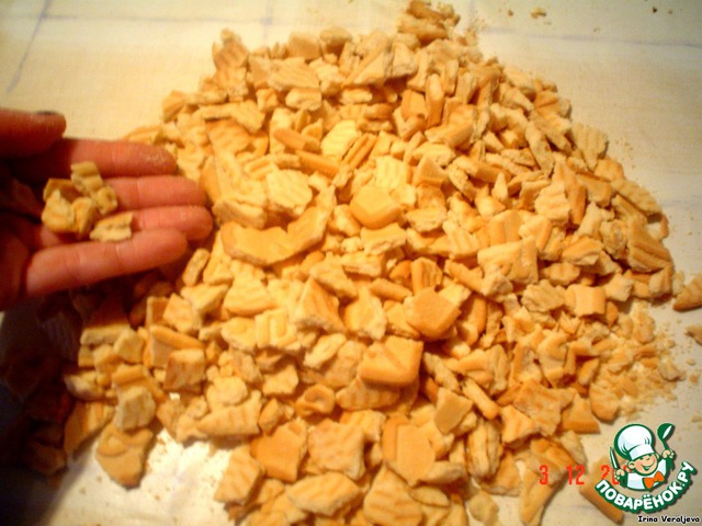 Сначала я разломала печенье на кусочки размером примерно 0,5 х 0,5 см. Я ломала руками, а потом еще немножко покромсала широким ножом.