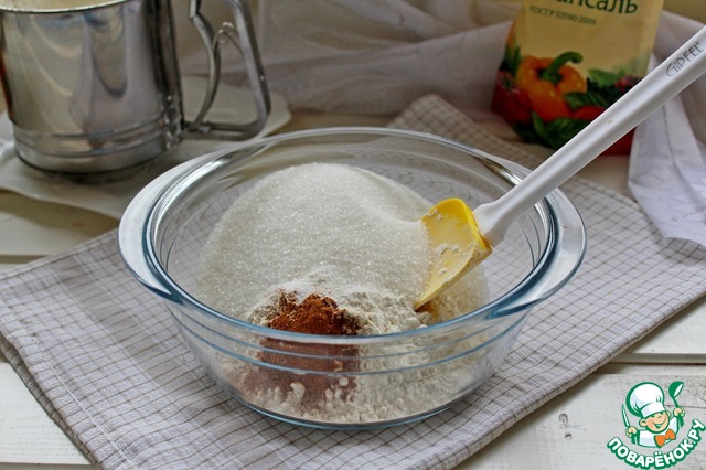 Отдельно в миске смешать сухие ингредиенты :просеянную муку, соль, разрыхлитель, корицу и сахар.