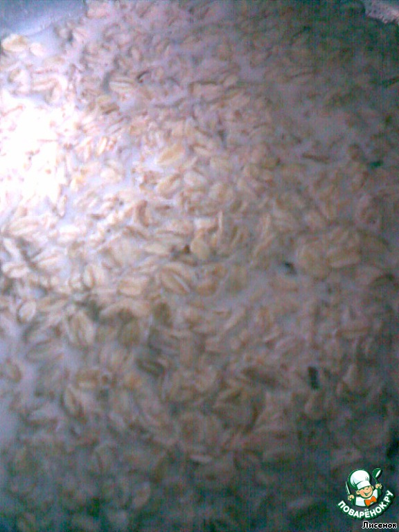 Овсяные хлопья залить теплым молоком и дать им набухнуть.