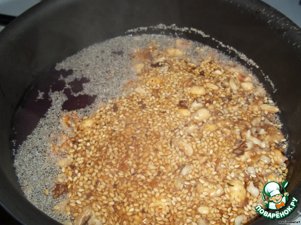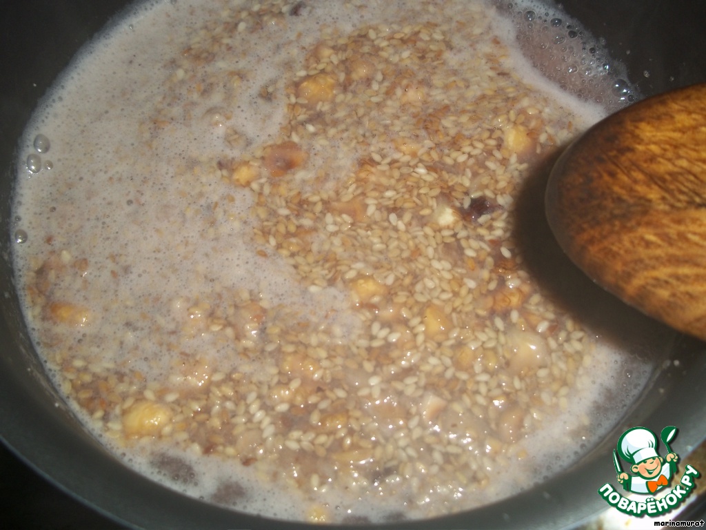 На сухой сковороде прокалить орехи и кунжут. В оригинальном рецепте нужно добавлять крэш (черные большие семечки), но я их не люблю, поэтому заменила на фундук. Вместо грецких орехов можете взять кедровые орешки.
