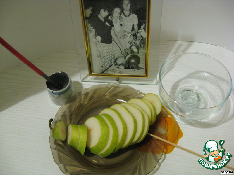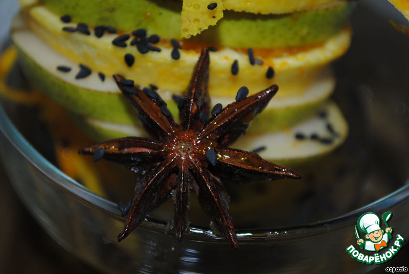 Аккуратно нанизываем все кружочки на бамбуковый шампур и устанавливаем в креманку (порций можно делать сколько угодно, в зависимости от количества народу ...) Сверху обливаем нашу бешеную грушу сиропом из апельсина, красиво посыпаем черным кунжутом, укладываем специи - бадьян, и заливаемся слезами, глядя на фото Осеннего бала...