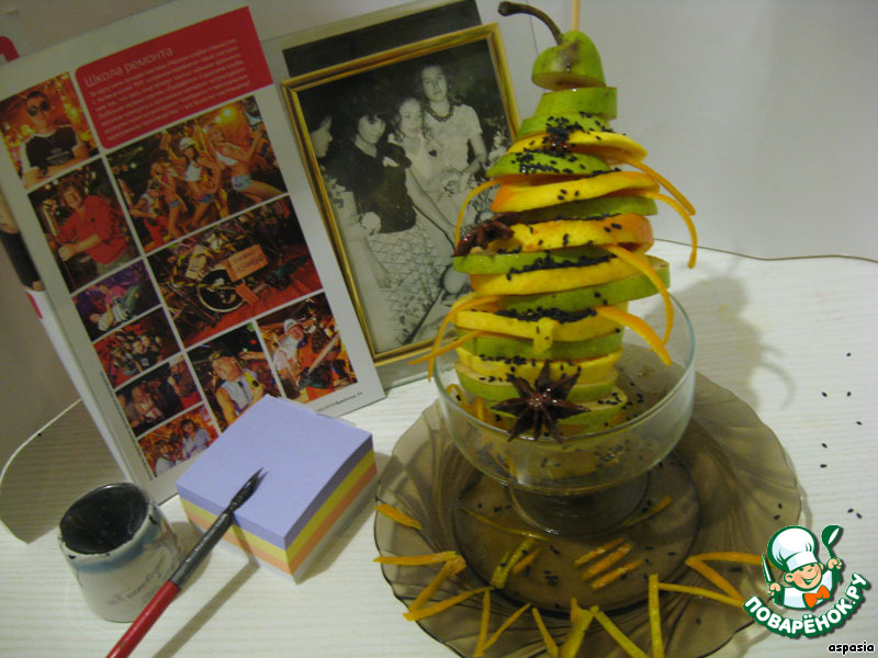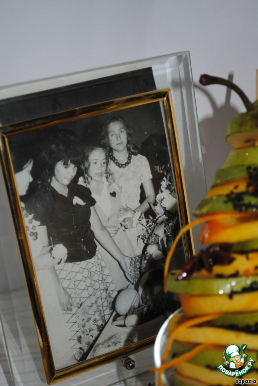 | Вы помните, как в школе проходил "Осенний бал"? Готовились букеты, красивые композиции из фруктов. А у нас исчезла наша фруктовая композиция бесследно. В честь этой детективной истории и назван десерт... После дискотеки нашлась и ваза - но пустая... Фрукты были уничтожены нашим ВИА (кто не знает - вокально-инструментальным ансамблем). Знать бы, что наш Юрка будет солистом знаменитого ансамбля "Земляне"... Не пожалели бы тогда груш и яблок! для конкурса "Вечер школьных друзей" |