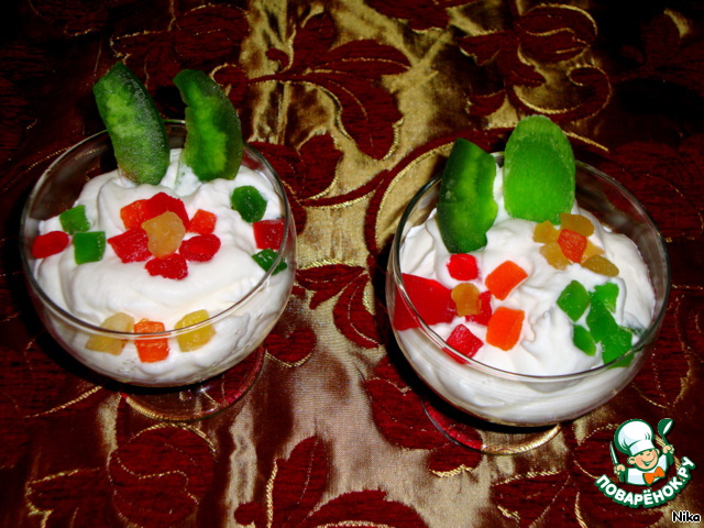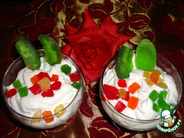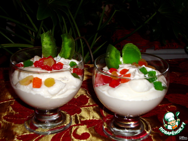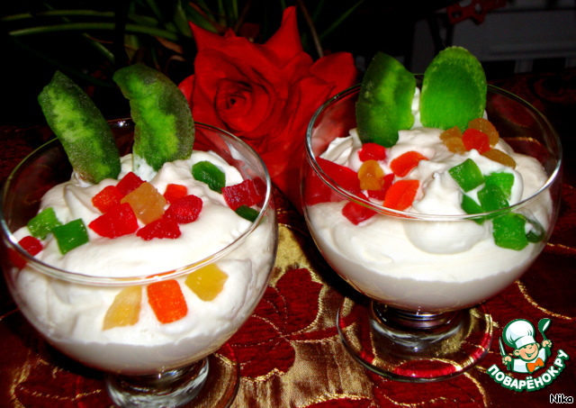 Сливки взбились, разложить в креманки, украсить (чем угодно - ягодами, тёртым шоколадом и др.) цукатами, которые предварительно были в тёплой воде 10 минут