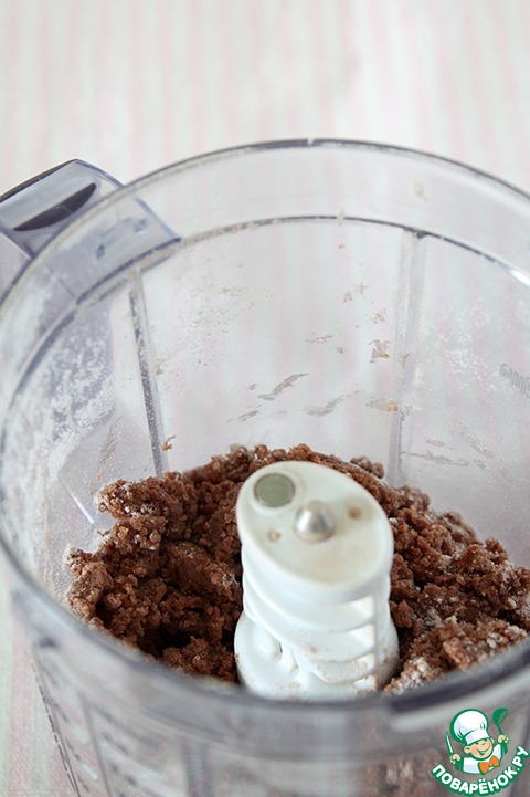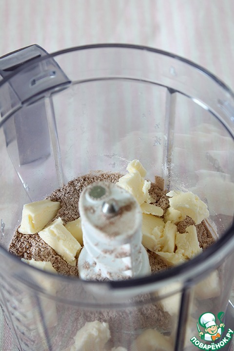 Сначала приготовим шоколадный крамбл. В принципе можно обойтись магазинным печеньем, размолотым в крошку, но я всё же за крамбл. Просеять муку, какао, добавить сахар и нарезанное кубиками холодное масло.