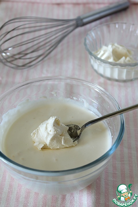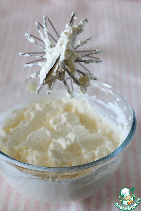 Для крема взбить сливки до мягких пиков. Добавить творожный сыр, это может быть даже мягкий, не крупинчатый творог. Можете добавить немного сахарной пудры, но это не обязательно, по вкусу.
