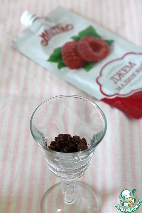 В стаканчики выложить немного крамбла, толщина слоя примрно 1 см, но это зависит ещё и от размера посуды.