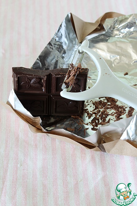 А теперь секретное оружие))) Для украшения нам понадобится шоколадная стружка, которую мы легко и непринуждённо сделаем с помощью овощечистки. Если есть малина, то она тоже чудесно украсит ваш десерт.