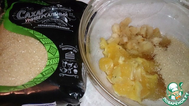 Очистить грушу, нарезать мелкими кубиками. Кусочки апельсина смешать с кусочками груши и тростниковым сахаром. Добавить размягченное масло, хорошо перемешать.