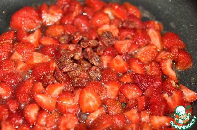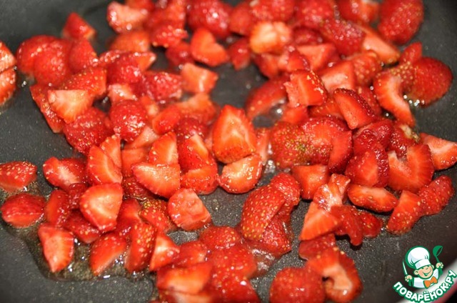 На сковороду наливаем оливковое масло, нагреваем, кладём 2/3 нарезанной клубники и тушим пару минут, помешивая лопаткой.