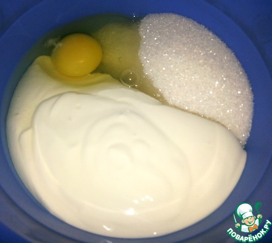 Смешать миксером яйцо, сахар, соль и сметану.
